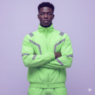 Afro-caribbean man in neon track jacket on lilac pastel studio google gemini fashion product model prompt