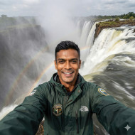 male traveler self portrait victoria falls adventure travel natural wonder waterfall landscape outdoor tourism africa destination exploration lifestyle solo travel mist cloud powerful water wide angle dynamic motion rugged journey scenic landmark travel energy nature experience square format prompt google gemini nano bananaImagine Buddy