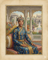 mughal miniature painting royal indian portrait historical court art imperial pavilion traditional miniature art brocade jama south asian heritage gold detailing cultural illustration classical indian painting pearl turban ornament historical costume fine art miniature museum quality artwork ornate motif royal court sceneImagine Buddy