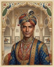 rajasthani miniature painting royal portrait indian traditional art palace courtyard jeweled turban angarkha attire heritage illustration handmade paper art cultural painting historical costume mughal era influence jharokha arches natural pigments fine art portrait south asian culture museum quality artwork royal indian heritage traditional motif classical indian artImagine Buddy