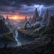 ancient ruins highland landscape stone titan stormy sunset fantasy environment cinematic lighting dramatic sky concept art epic fantasy forgotten civilization wide angle digital painting environmental detail tragic mood ruins landscape lightning clouds high detail prompt google gemini nano bananaImagine Buddy