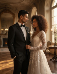 heterosexual couple engagement romantic historic mansion classic formal wedding attire golden hour lighting emotional connection natural poses high end fashion editorial composition luxury interior realistic skin professional lens ultra high resolution cinematic style love story elegant romance heritage architecture opulent setting romantic luxury prompt google gemini nano bananaImagine Buddy
