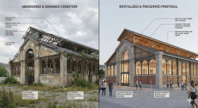 historic market hall architectural restoration urban heritage before and after building revitalization ironwork restoration roof truss repair preserved architecture cultural heritage conservation proposal architectural visualization abandoned building restored facade reclaimed timber wrought iron adaptive reuse neutral lighting heritage preservation public space prompt google gemini nano bananaImagine Buddy