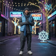 Male fashion blogger at winter city carnival portrait google gemini prompt