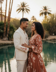 romantic couple cinematic portrait bohemian style desert oasis wedding fashion emotional connection fine art style love story natural pose outdoor romance earthy tones gentle smile warm lighting free spirit engagement concept artistic mood intimate moment couple photography destination wedding lifestyle romance prompt google gemini nano bananaImagine Buddy
