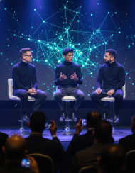 ai scientist robotics engineer futurist tech panel future technology innovation conference expert discussion artificial intelligence robotics digital transformation tech enthusiasts engineers neural network visuals chrome seating monochrome fashion cinematic lighting shallow depth of field science event emerging tech smart systems research talk prompt google gemini nano bananaImagine Buddy