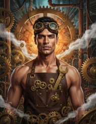 steampunk portrait inventor man mechanical workshop brass gears leather apron clockwork machinery industrial fantasy steampunk character steam power retro technology glowing machinery victorian style imaginative engineering cinematic composition digital illustration mechanical detail fantasy industry concept art creative workspace alternate history prompt google gemini nano bananaImagine Buddy