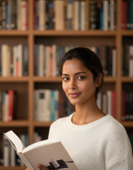 published author writer professional literary focused adult creative portrait bookshelf blurred background warm wood wide aperture key light backlight intellectual professional attire indoor environment author portrait literature content creator prompt google gemini nano bananaImagine Buddy