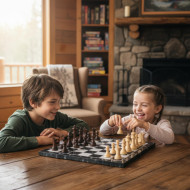 board game siblings cabin indoor play family bonding childhood kids game playtime lifestyle cozy interior rustic setting joyful interaction natural expression realistic toy candid family moment shallow depth of field soft lighting winter retreat ecommerce image prompt google gemini nano bananaImagine Buddy