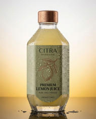 Premium lemon drink bottle on black acrylic with condensation google gemini prompt