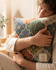 Young man hugging velvet cushion cozy lifestyle portrait google gemini prompt