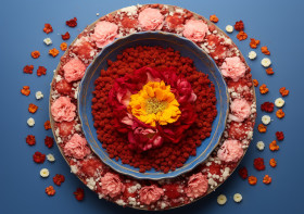 Rangoli decoration with orange flower in bowl, diwali festival stock image, diwali festival ai prompt
