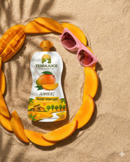 Mango drink pouch flat lay with mango slices on sandy background google gemini prompt