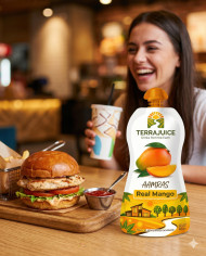 Mango drink pouch with chicken burger in casual restaurant google gemini prompt