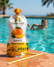 Mango drink pouch near pool on sunny summer day refreshment google gemini prompt