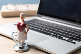 A woman in a white t shirt is holding up a stethoscope in front of a laptop, health and medical stock image