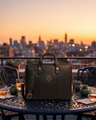 leather bag office bag rooftop terrace cafe table sunset light city skyline luxury lifestyle travel accessory outdoor scene relaxation social setting prompt google gemini nano bananaImagine Buddy