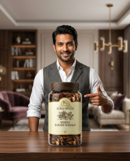 Premium spice jar with confident man in modern living room ad google gemini prompt