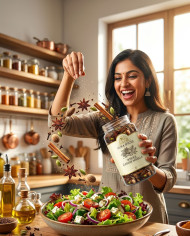 spice jar indian woman fresh salad sprinkling spices healthy food kitchen lifestyle seasoning cooking action natural light vibrant food home kitchen prompt google gemini nano bananaImagine Buddy