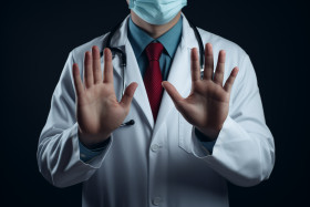 Doctor gesture of hands showing stopping the sign and a stethoscope, health and medical stock image