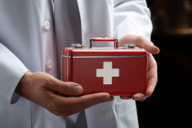 Doctor gives first aid medical kit model to a patient, health and medical stock image