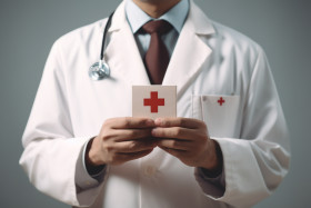 Doctor with red cross emblem on white background premium photo image 123, health and medical stock image