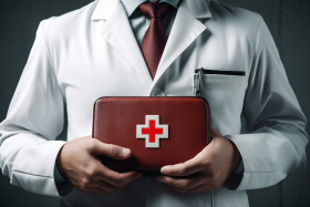 Doctor with red cross emblem on white background premium photo image 123, health and medical stock image