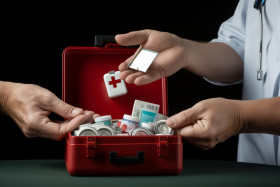 Doctor gives first aid medical kit model to a patient, health and medical stock image