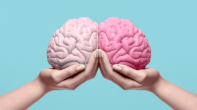 Human brain in pink hands, human brain image