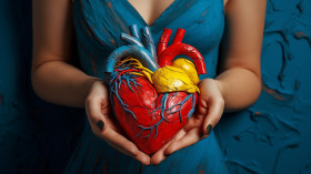 Woman's hands holding model of a heart, human heart image