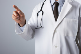 A doctor points his finger towards the side with a doctor jacket vgif, health and medical stock image