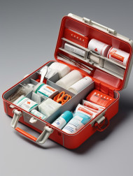 Simple open red first aid kit with with medicines for drugstore category 3d render illustration, health and medical stock image