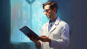 Medical professional reading tablet, medical images stock