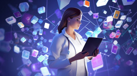 Nurse using tablet to provide patient care, medical images stock