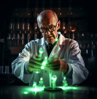 Chemist conducts chemical reaction in lab, medical images stock