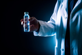 A doctor in white coat is pointing to medicine bottle, health and medical stock image