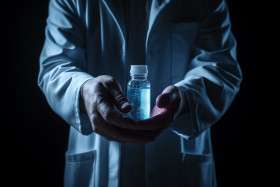 A doctor in white coat is pointing to medicine bottle, health and medical stock image