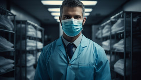Doctor in medical clothing and blue mask standing, health and medical stock image