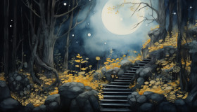 Dark forest stairway to the sunlight, cave painting style