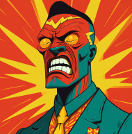 A cartoon of a man with a red suit and yellow eyes, lucha libre