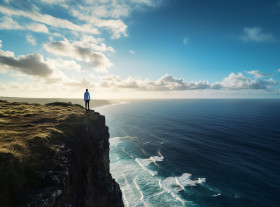 Person stands on cliff overlooking ocean, mental health