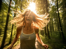 Woman sprints through lush green woods, mental health