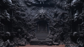 The black wall of an ancient structure that has some chinese decorations on it, bas relief art