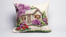 Countryside house and green flowers cross stitch pillow, cross stitching style art