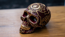 An intricately embossed sugar skull on a light wooden table, cross stitching style art