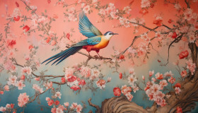 The wallpaper depicts a bird flying across a pink and orange floral pattern, decoupage style art