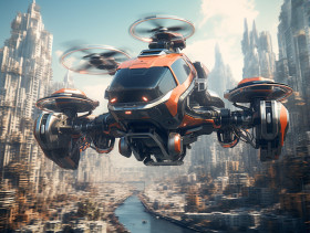 City in the sky with flying car