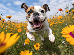 Dog frolics in field of flowers