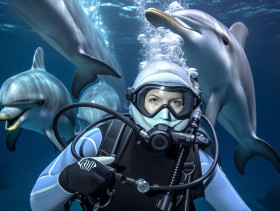 Diver and dolphins play in the ocean