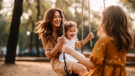 Mother and daughter swinging in the park